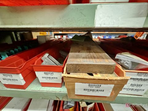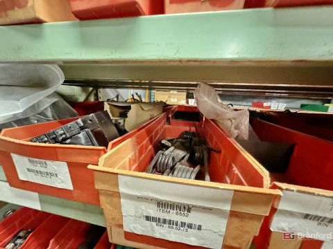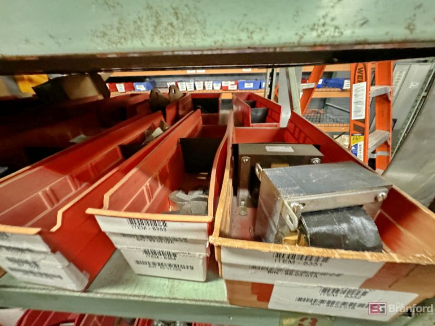 Shelving unit and contents including: Coil for Trolley, Rectifiers, Relays, Crane Hoist Parts, Resistors, Couplings, Pulleys, Coil Switches, Drive Belts - Please inspect for details ***Please Note - A fee of $400 will be charged for this lot to package and load.
