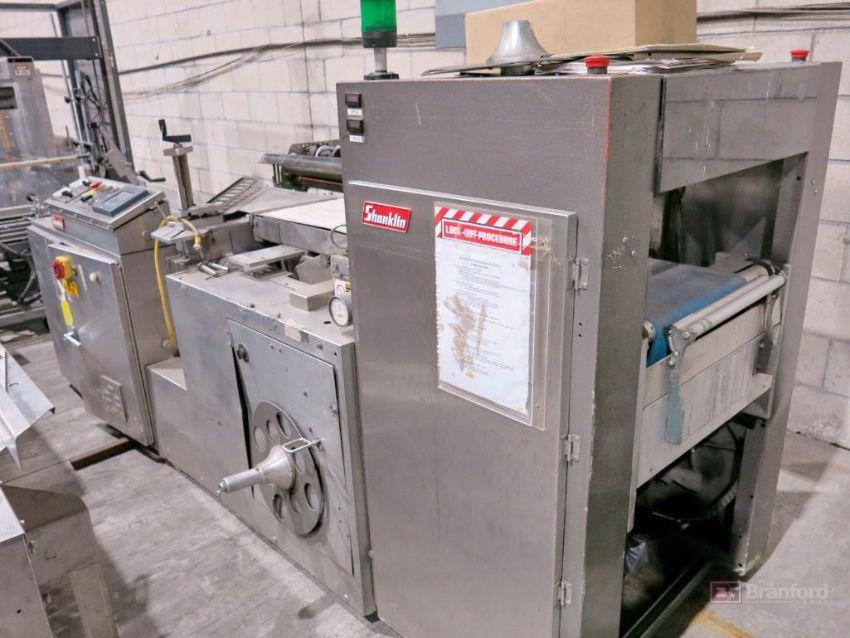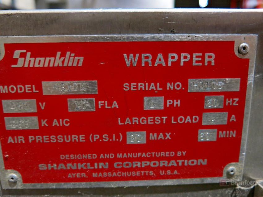 Shanklin HS Series Model HS1DA High Speed Automatic Wrapper, w/ Fully Automatic Flow Operations, Neat Trim Seals, S/N H0105, w/ Shanklin Infeed Product Conveyor Feeder, Shanklin Plastic Roll Dispensers