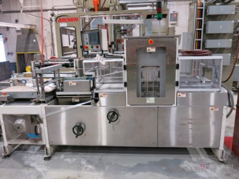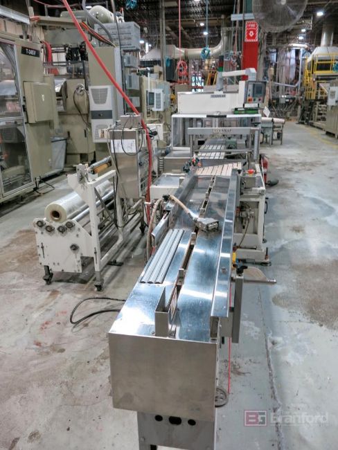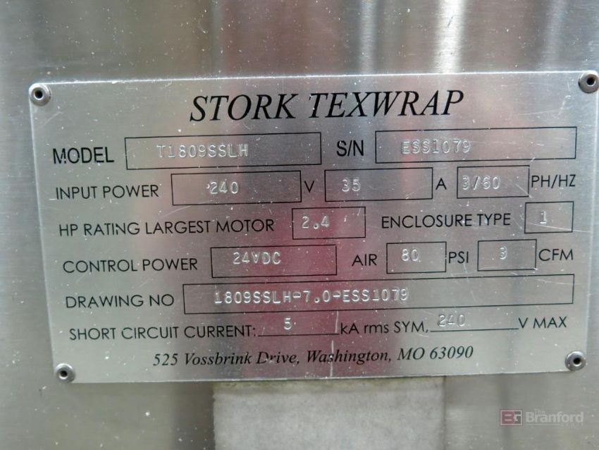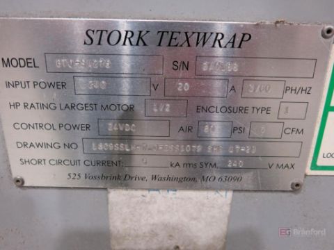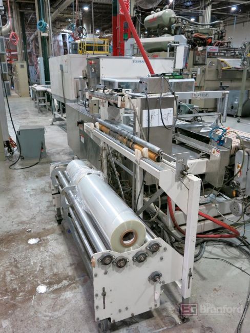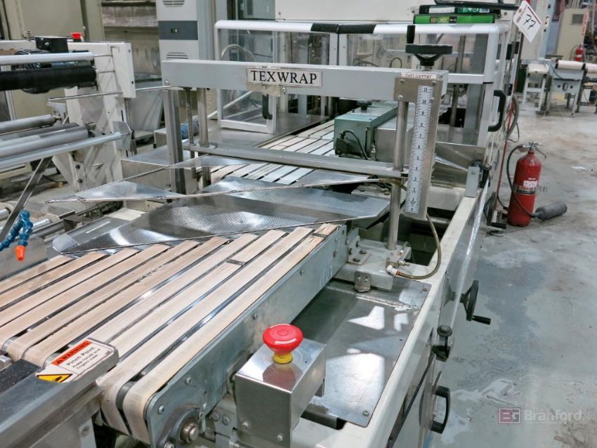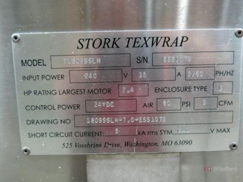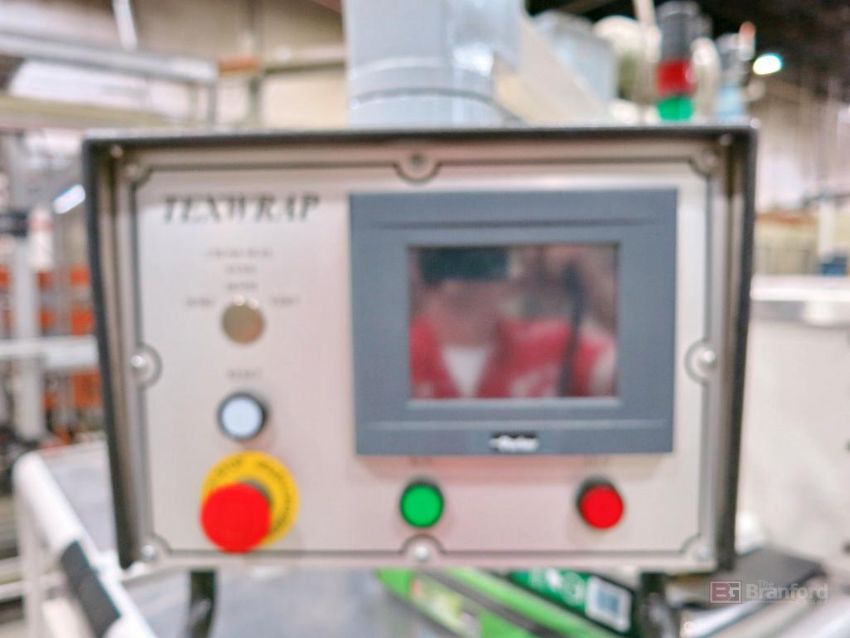 Texwrap Model T1809SSLH Wrapping Machine w/ Stork Texwrap Model BTO-SA275 Infeed Indexer, Roll Dispenser, Texwrap/Parker Digital Display Controls, Green Machine Side Sealer, w/ Assoc. Transformer, S/N ESS1079