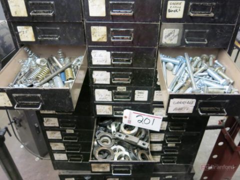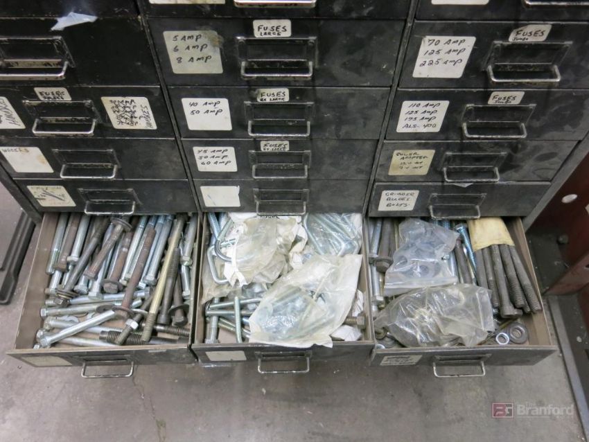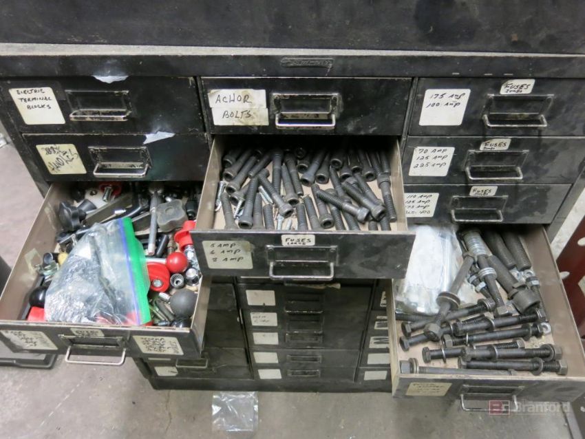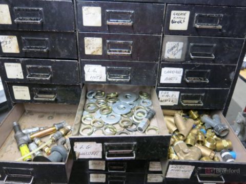 (2) Small Parts Bins w/ Contents Incl LG Nuts & Washers, Allen Wrenches, Collars, Hooks, I-Bolts, Hydraulic Fittings, Water Fittings, Anchor Bolts, Fuses, Other Industrial Related Items - Please Inspect