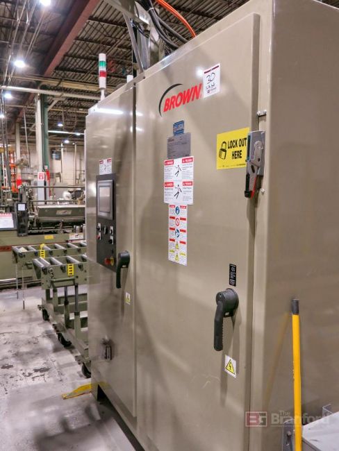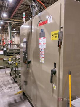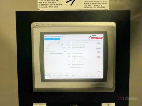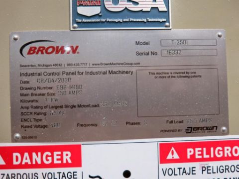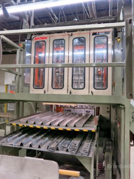 Brown Model T-350L Horizontal Trim Press, S/N 16332 (2020), 15,231-Hours, Max. Die Size 22" W x 58" L, 30-Ton, Up To 145 spm, 55” Max Sheet Width, 4.5"-16.5" Stroke Adjustment, Programmable Controls w/ Allen Bradley Panelview Plus Digital Display; w/ (2) Die Heavy Duty Rolloff Carts, Canopy Feed, Collection Table; Note Molds and Trim Dies are Sold Separately