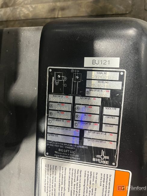 Big Joe 2-Ton Electric Fork Lift; Model: LVE-40-189-ISS; Max Capacity: 4,000lbs; 189" Max Height; 80V; S/N 2321301394; 19-Hours, Manual, No Fork Positioners, w/ Side Shifters