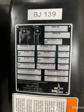 Big Joe 2-Ton Electric Fork Lift; Model: LVE-40-189-ISS; Max Capacity: 4,000lbs; 189" Max Height; 48V; S/N 2321300230; 3-Hours, Manual, No Fork Positioners, w/ Side Shifters