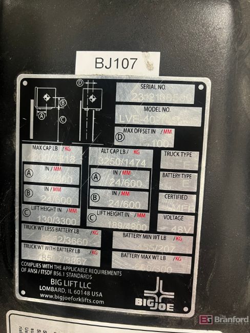 Big Joe 2-Ton Electric Fork Lift; Model: LVE-40-189-ISS; Max Capacity: 4,000lbs; 189" Max Height; 48V; S/N 2312100560; 640-Hours, Manual, No Fork Positioners, w/ Side Shifters
