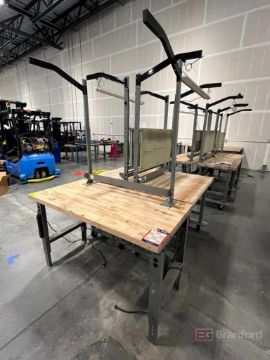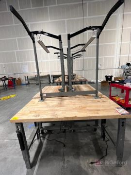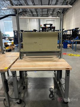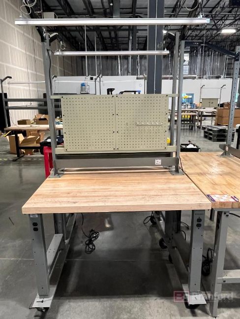 (2) Global Industrial Work Benches on wheels with Peg Boards and light fixture. 30"x48"x37.5"; (1) Global Industrial Work Bench. 30"x60"x37"