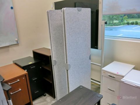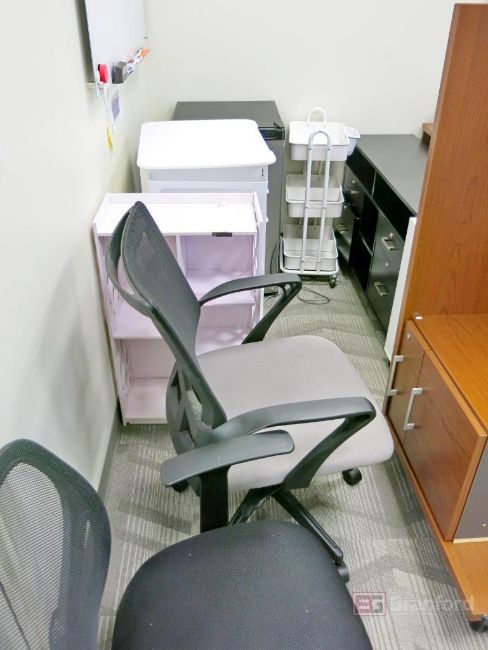 Contents of Storage Room Area Incl Desks, Desk Risers, Office Chairs, Mini Refrigerators, Bookcases, File Cabinets, Dry Erase Board, Etc - Please Inspect