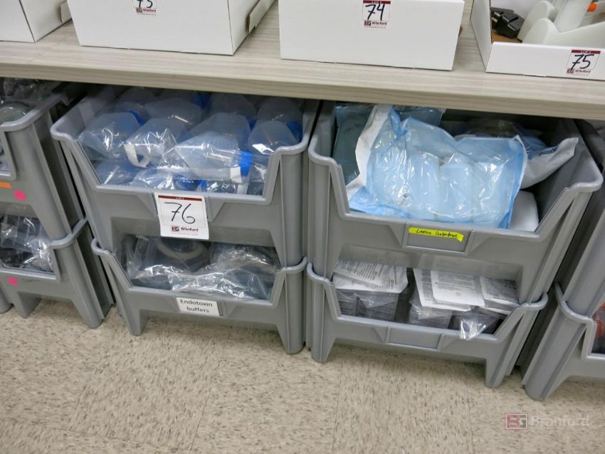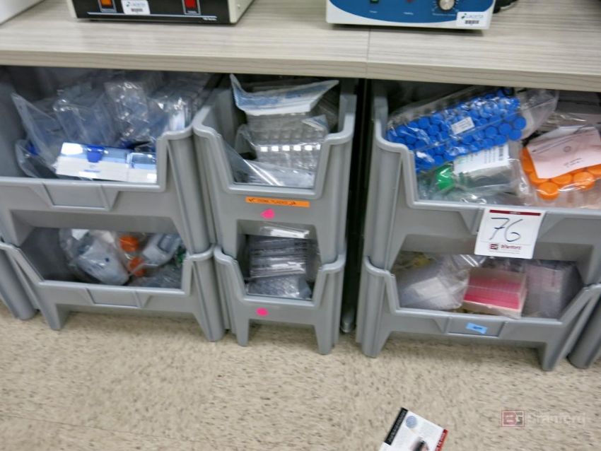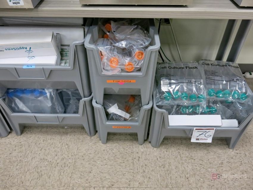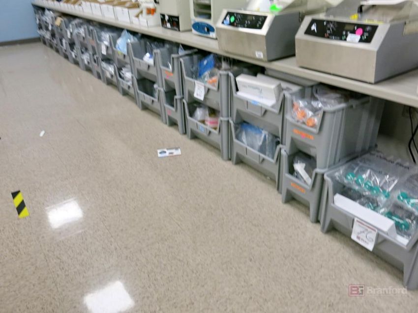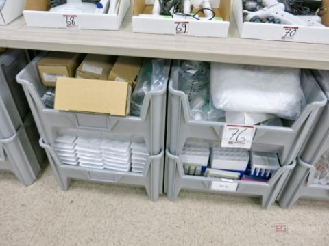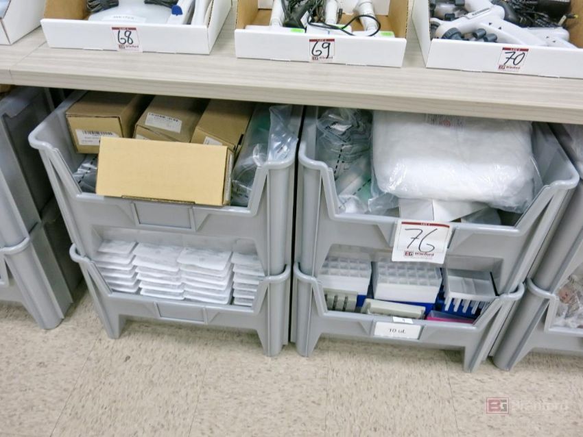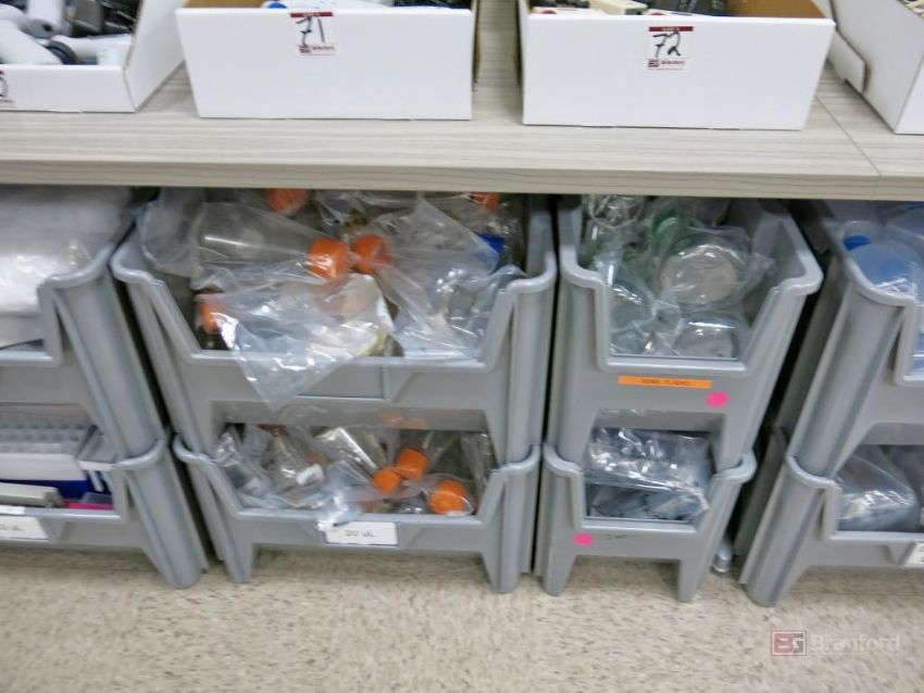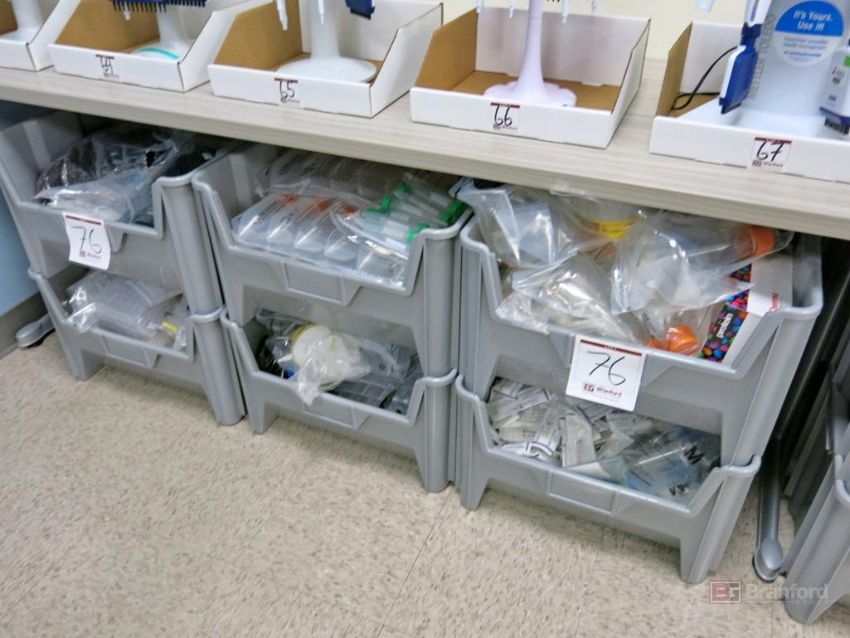 Large Lot of Nestable Stackable Bins w/ Contents Incl Consumables, Tip, Tubes, Flask, Other Consumable Items - Please Inspect