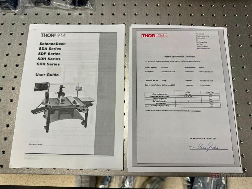 ThorLabs Nexus Breadboard science desk 875120A, SN340826, 750x1200x60mm, yr 2022, & additional add on components including parts holders, lighting add ons, Maneuverable arms, extended outlets, etc as photographed, Located in Boise, ID