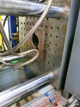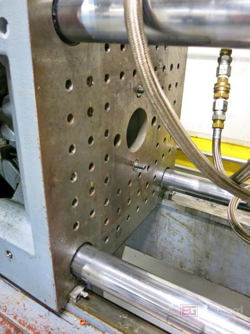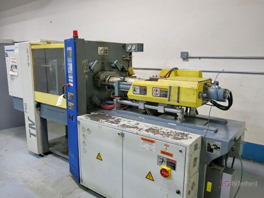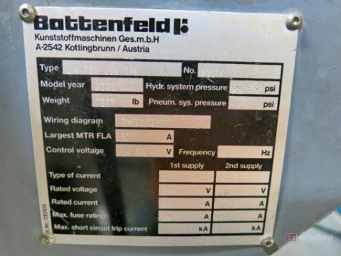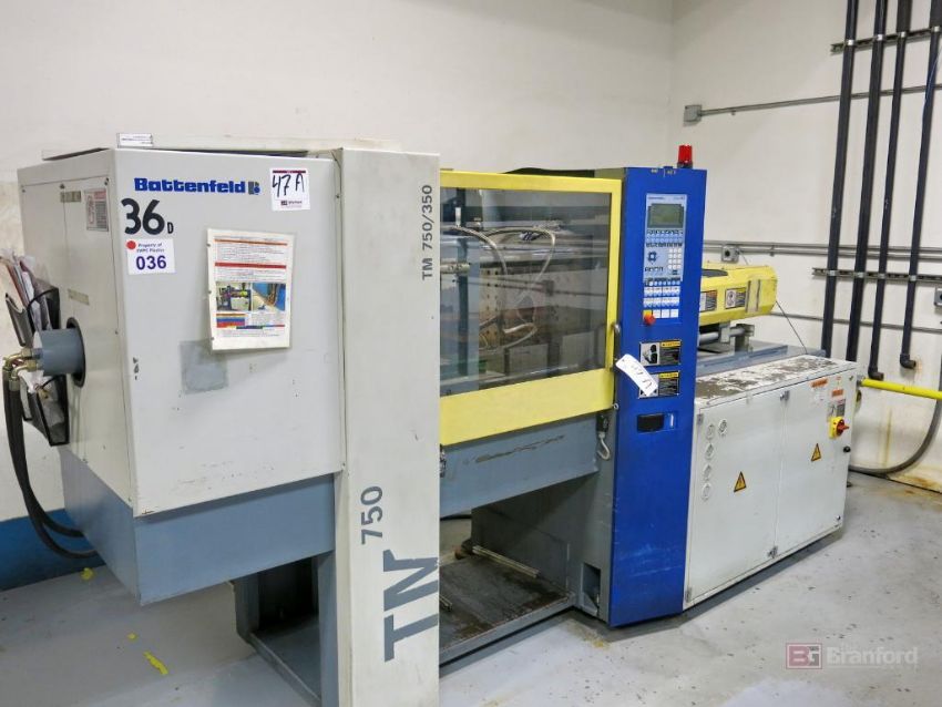 Battenfeld Model TM 750/350 75-Ton Horizontal Plastic Injection Molding Machine, 5.1-Oz Shot Size, 30mm GP Screw, Die Min. 7.87, Die Max. 19.7mm, Tie Bar Spacing 370mm x 370mm, Battenfeld Unilog B2 Digital Controls, S/N 23017, 2000