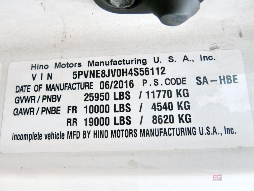 Hino Model 268 Diesel 24' Box Truck, Automatic, GVWR/PNDV 25950-Lbs, GAWR/PNBE FRF 10000-Lbs, RR 19000-Lbs, Mileage: 345,732, VIN 5PVNE8JV0H4S56112, (2017); NOTE: Roof of Box is Damaged