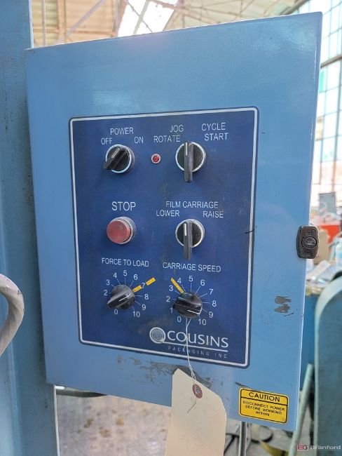Cousins Stretch Wrap Machines; Model HP2100; max. load weight: 5,000-lbs.; load dimensions: 50"x 50"x 87"; turntable dimensions: 57" diameter, 3" off floor; table revolutions: 3-12 RPM; film wrap: 20"; 115V; 12 Amps; 1-phase; 60 cycle; Gavlick Inventory # 715-0711