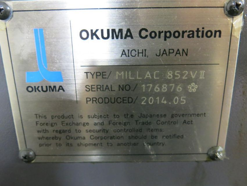 Okuma Millac 852V II CNC Vertical Machining Center, OSP-P300M CNC Control, X-120", Y-33", Z-29", 126” x 34” Table, 36-Position ATC, 6,000 RPM, CAT 50, Probe, MP-Systems Thru-Spindle Coolant, S/N 176876 [2014]