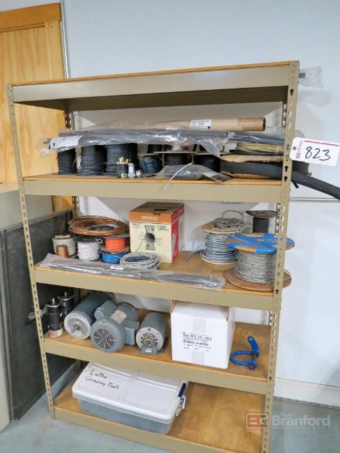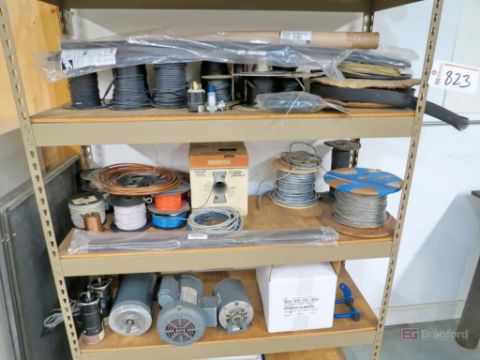 Sections of Shelving, w/ motors, wire, tubing, file cabinets, hardware, etc.