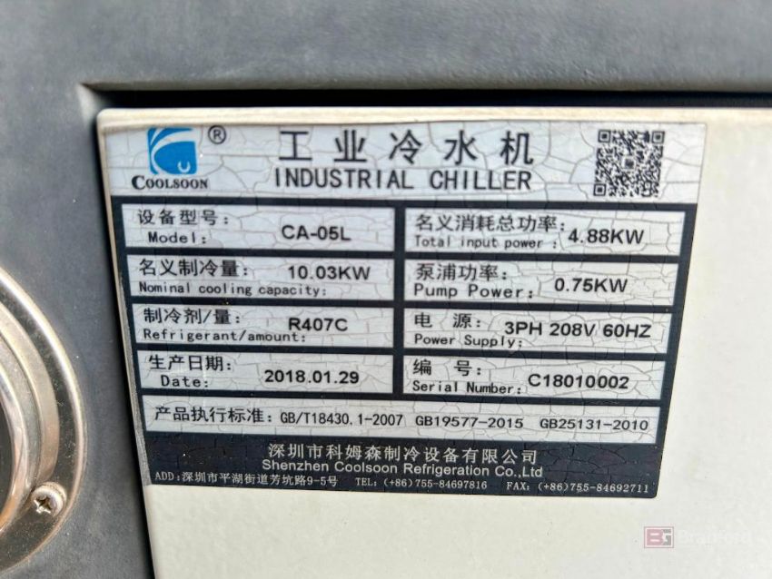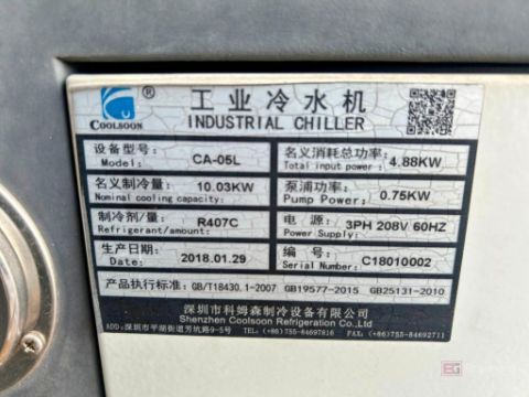 Coolsoon Industrial Chiller; Model CA-05L; Nominal Cooling Capacity: 10.03KW (2018),