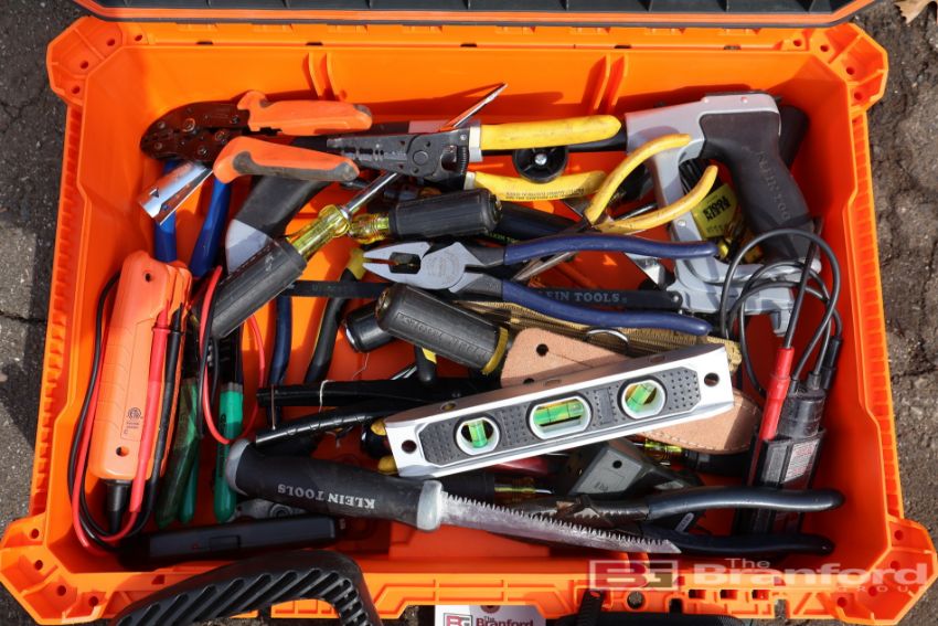 Large Lot of Klein Tools Including: Fish Tape, Screwdrivers, Saw, Pliers, Voltage Testers & Toolbox