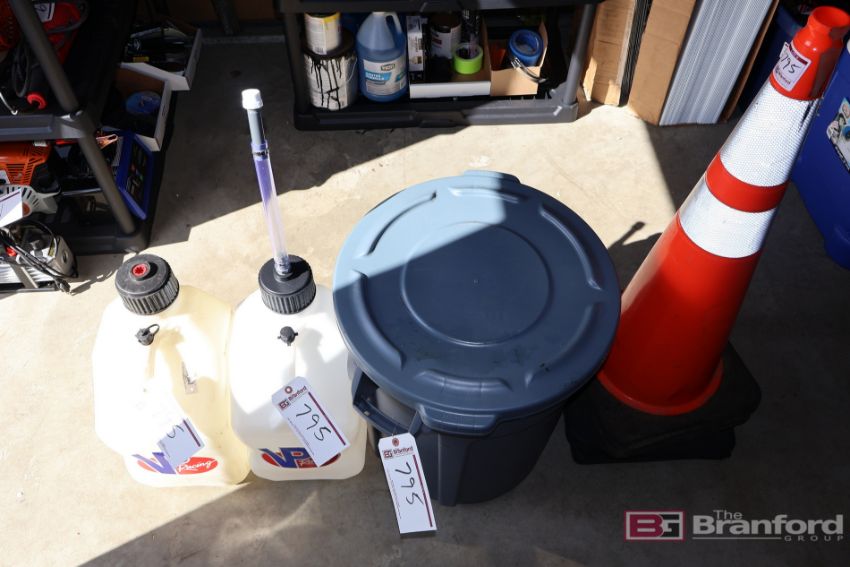 (2) Fuel Cans, (1) Rubbermaid Brute Trash Can, (4) Safety Cones