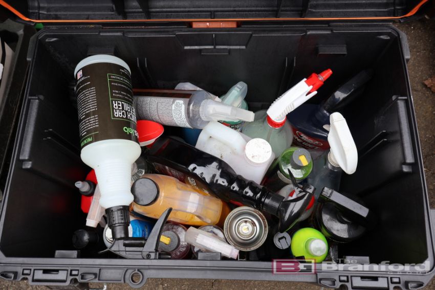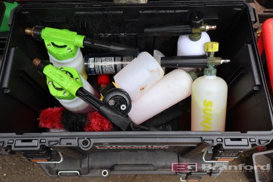 Automotive Detailing Lot Including: Portland 1750psi Power Washer, Brushes, Buckets, Ridgid Toolboxes, Bauer Buffer, Pads, Kobalt 6 Gallon Air Compressor, Soap / Degreaser, Wax, Pittsburg Creeper, Polisher, Sprayer & Detail Seat