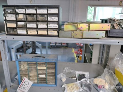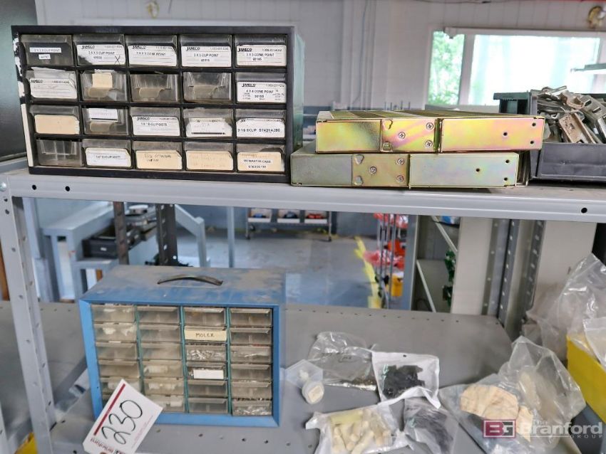 (2) Sections of Medium Duty Racking w/ Contents Incl But Not Limited To: Molex Connectors, Jacks, Reciprocals, Battery Holder, Knobs, Small Parts Bins, Numerous Other Industrial Related Items - Please Inspect