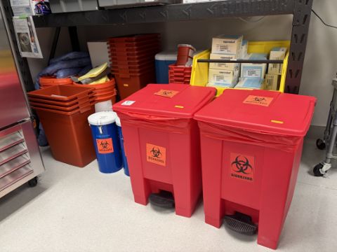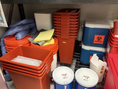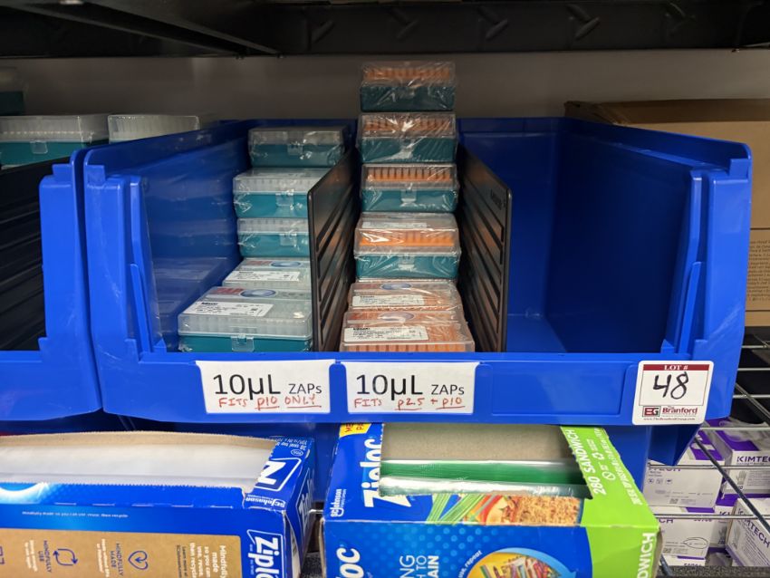 Large Lot of Consumables Including :Biohazard Bins, Eppendorf Protien LoBind Tubes, Eppendorf Safe-Lock Tubes, Qiagen Collection Tubes, Kimtech Terling Nitrile Gloves, Various Sized Labcon Pipette Tips; w/ Gladiator Rack